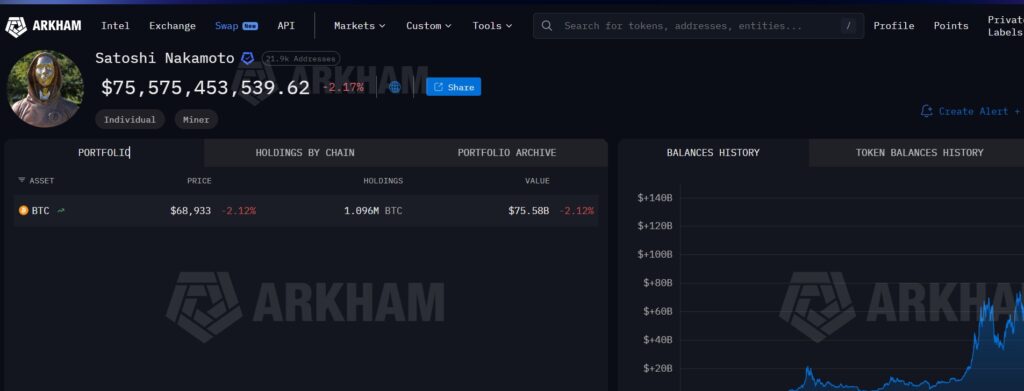 L’autre aimant de cette histoire, c’est la taille du mythe. Arkham a élargi son suivi d’adresses attribuées à Satoshi (via le “Patoshi Pattern”) et regroupe environ 1 096 354 BTC sur près de 22 000 adresses.