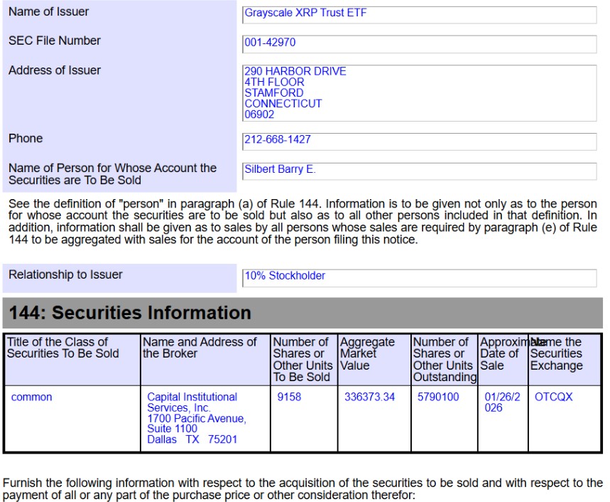 Les documents évoquent d’abord deux noms connus : Barry Silbert et Craig Salm. Selon des dépôts (Form 144), Silbert a déclaré la vente de 9 158 actions GXRP, et Salm 7 123 actions GXRP. Il faut comprendre ce que signifie ce type de formulaire. Cela coïncide avec la hausse de Silver qui dépasse Solana et XRP sur Hyperliquid.