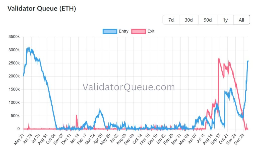 - En face, la file d’entrée explose à environ 2,6 millions d’ETH, avec jusqu’à 45 jours d’attente.